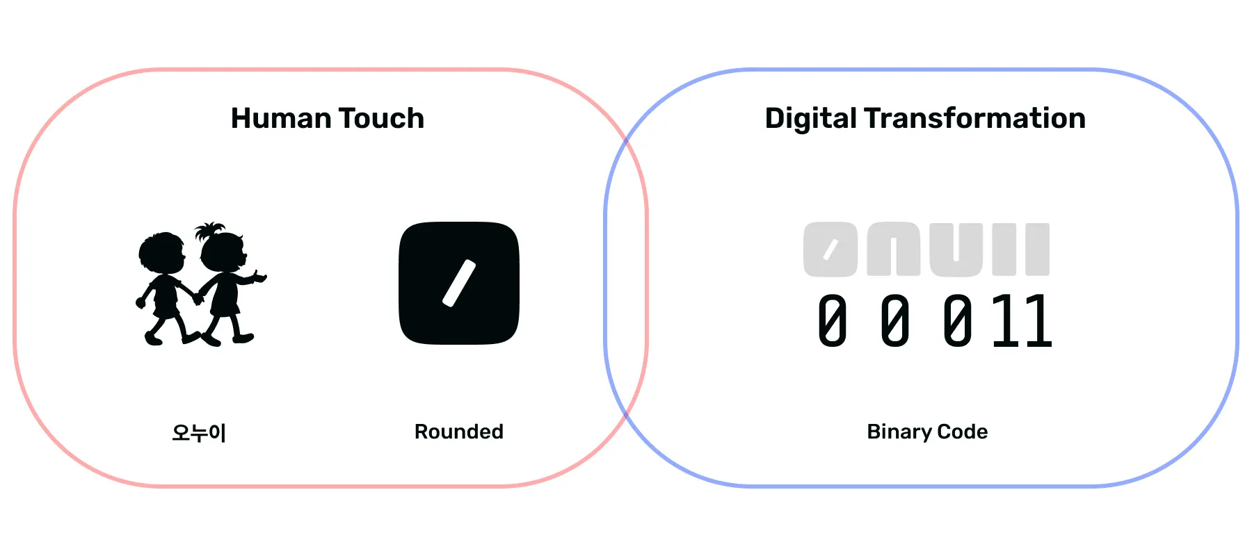 오누이의 로고는 HT(Human Touch)를 표현하는 오누이 네이밍과 라운디드 디자인, 그리고 DT(Digital Transformation)을 형상화한 이진법 코드 00011를 결합한 디자인입니다. 이진법 00011이 의미하는 숫자 3이는 주식회사 오누이가 혁신하고자 하는 교육의 3요소 수업, 교재, 관리를 상징합니다. 심볼마크는 알파벳 ‘O’와 숫자 ‘0’을 직관적으로 표현하고있으며 30도 각도로 기울어진 속공간은 프로그래밍 시 알파벳 ‘O와 숫자 ‘0’을 구분할 수 있는 포인트인 대각선을 상징합니다.