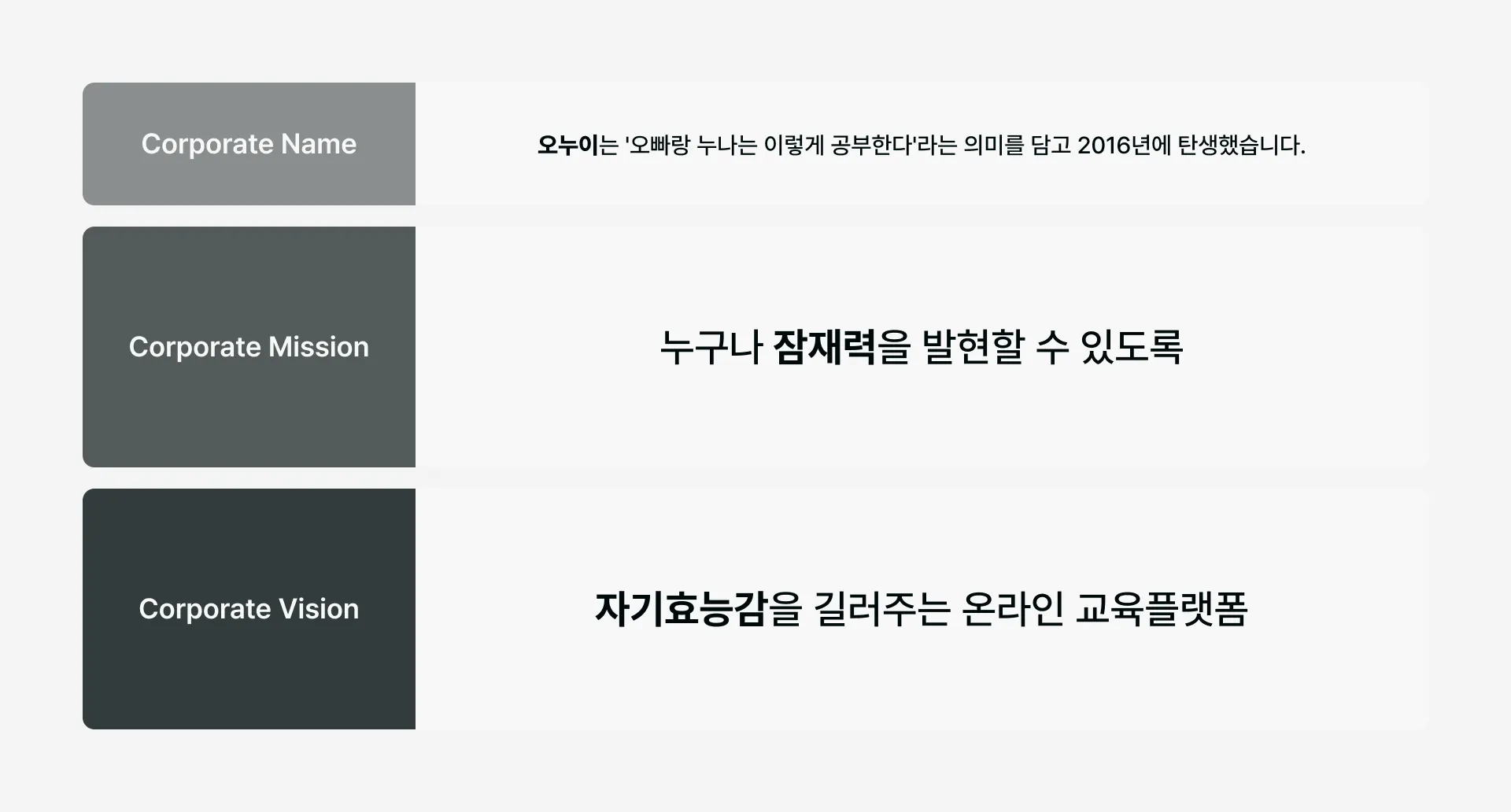 오누이의 슬로건 <Unlock Your Potential>은 <누구나 잠재력을 발현할 수 있도록> 이란 오누이의 미션을 이루고자 하는 우리의 의지를 담고 있습니다.